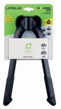 Ursus, Zweibeinständer, Jumbo, Max Load 100kg, 100% Aluminium, sehr stabil, Besonders breite und standfeste Spreizung, eng anliegend während der Fahrt, patentierter Mechanismus, empfohlen für E-Bikes, Lasten- Post- und Zustellräder, Tandems, Räder mit Kindersitz sowie Verleihräder (auch bei starkem Wind standsicher), schwarz H Max=300 mm, mit langer Schraube und Platte, Werkstattverpackung (ohne SB-Karte, lose im Karton) 5 Stück pro Paket