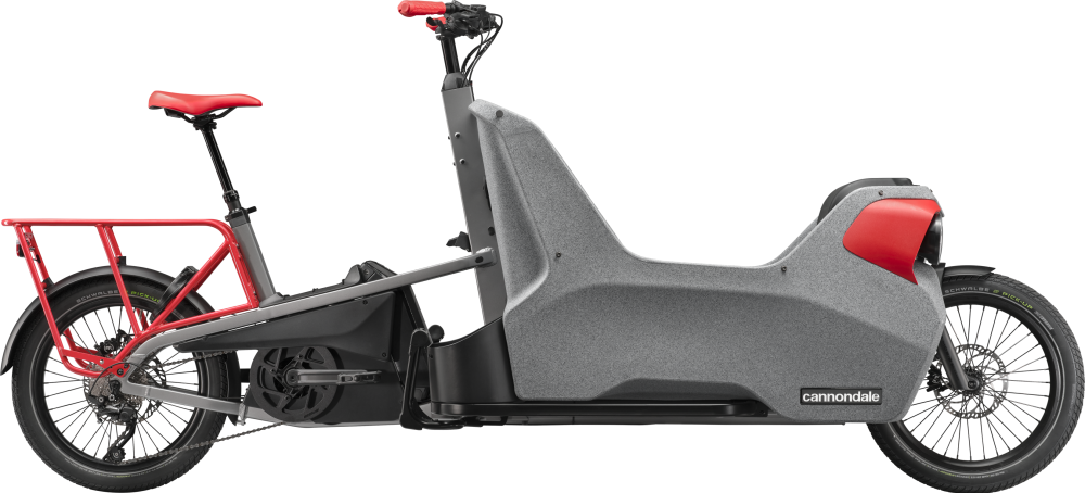 Rahmen: SmartForm C2 Alloy low step cargo frame, cable steering, weatherproof double kid cabin, semi-integrated cable routing, external dual battery compatible, integrated kickstand, integrated utility compartment, kids seat compatible rear rack with Racktime SnapIt 2.0 & trailer hitch mount, dual LED front lights, triple bottle cage mount
