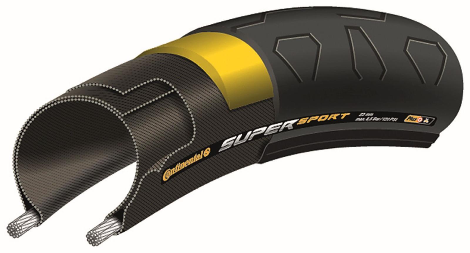 Continental, Bereifung, SuperSportPlus, 700x23C (23-622), Drahtreifen, Farbe: schwarz/schwarz, Plus Breaker, Luftdruck: 7,5 bar (max. 8,5 bar), 3/84 TPI, Gewicht: ca. 440g, (Herst.-Nr.: 0100344)