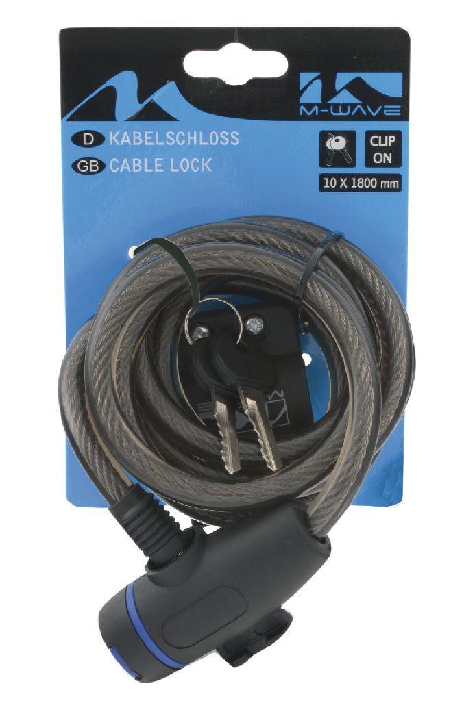 M-WAVE, Schlösser, Spiralkabelschloss, S 10.18, schwarz, 10x1800mm, Schließzylinder mit Staubschutzkappe, mit Clip-on-Halter